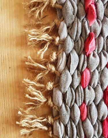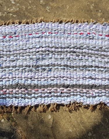 Cotton and cotton jersey clothes too worn for the charity shop have been saved from the rag bin as Lou repurposed her family’s old t shirts, shirts, legging and vests into doormats, much in the old spirit of rag rugging.